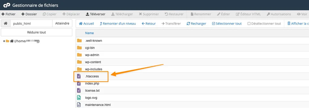 Si vous ne voyez pas ce fichier, il est possible qu’il soit simplement masqué. Comme son nom commence par un point, il est considéré comme un fichier caché sur les systèmes Linux. Dans ce cas, il suffit d’activer l’option permettant d’afficher les fichiers cachés (ou masqués) dans votre gestionnaire de fichiers ou votre client FTP.
